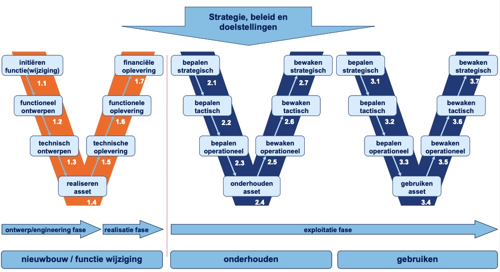 Modern Asset Management begint bij het vaststellen van heldere bestuurlijke doelen over functionaliteit, risico’s en investeringen van ‘assets’. Ook zijn de doelen van Duurzaamheid een uitgangspunt welke op bestuurlijk niveau wordt vastgesteld. Op tactisch niveau wordt de planvorming en benodigde informatie voorbereid. Het uitvoerende team realiseert de onderhoudswerkzaamheden.